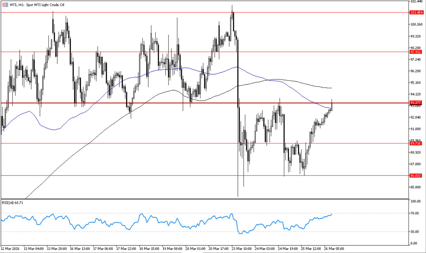يتحرك الخام الأمريكي الخفيف في اتجاه هابط على اطار الساعة, ويتداول حول مستوى 93.40 الذي يمثل مستوى مقاومه افقي على اطار الساعة, وبالارتداد منه لاسفل يدعم استمرار الاتجاه الهابط واستهداف مستوى 89.70 ثم 86.80. يظهر مؤشر القوة النسبية احتمالات استمرار الاتجاه الهابط بتحركه حول مستوي 70 من منطقة التشبع الشرائي.